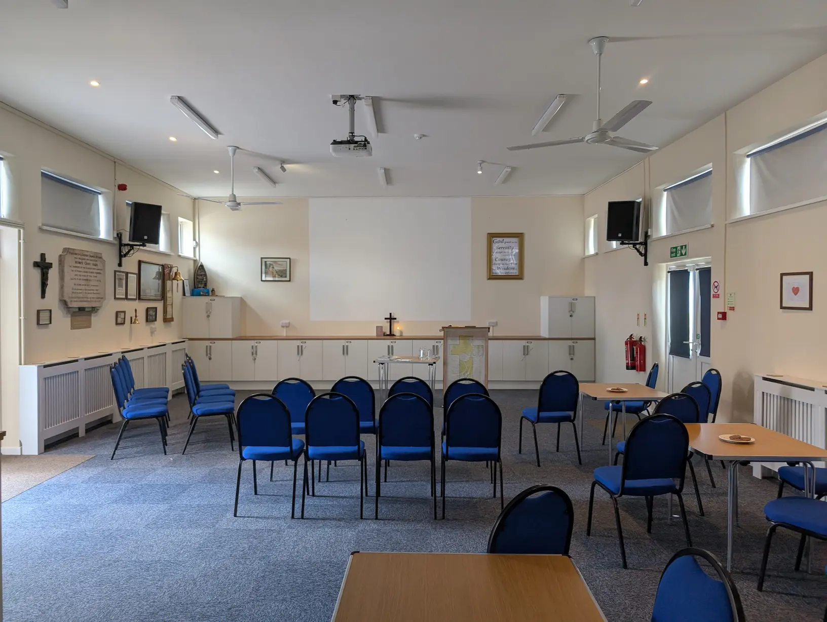 The hall measures approximately 10.5 metres by 6 metres and can accommodate up to 70 people standing or 28 seated around small tables. The space is carpeted, heated by gas central heating, and lit with LED strip lights. A large presentation wall is suitable for projection and display.